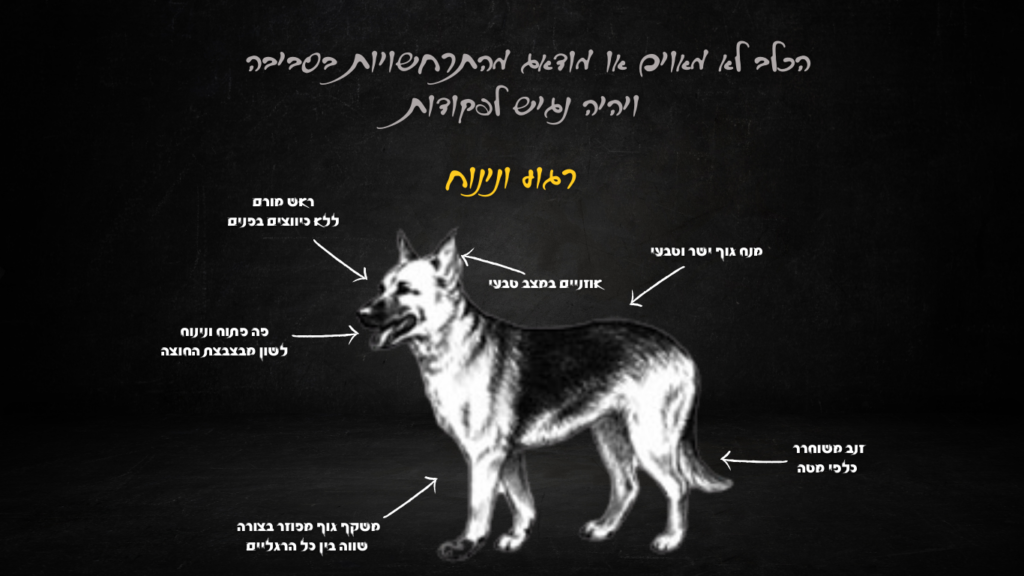 ראש הכלב יהיה במצב טבעי, לא גבוה מדי ולא נמוך מדי. הוא יישאר במצב ניטרלי, לא מתוח, ויתחבר בצורה הרמונית לגוף. עיניו יהיו רגועות, ללא מתח, והכלב עשוי לפזול או להימנע מקשר עין ישיר אם הוא מרגיש שליו ומאוזן. הוא לא יפגין שום סימן של פחד או איום.