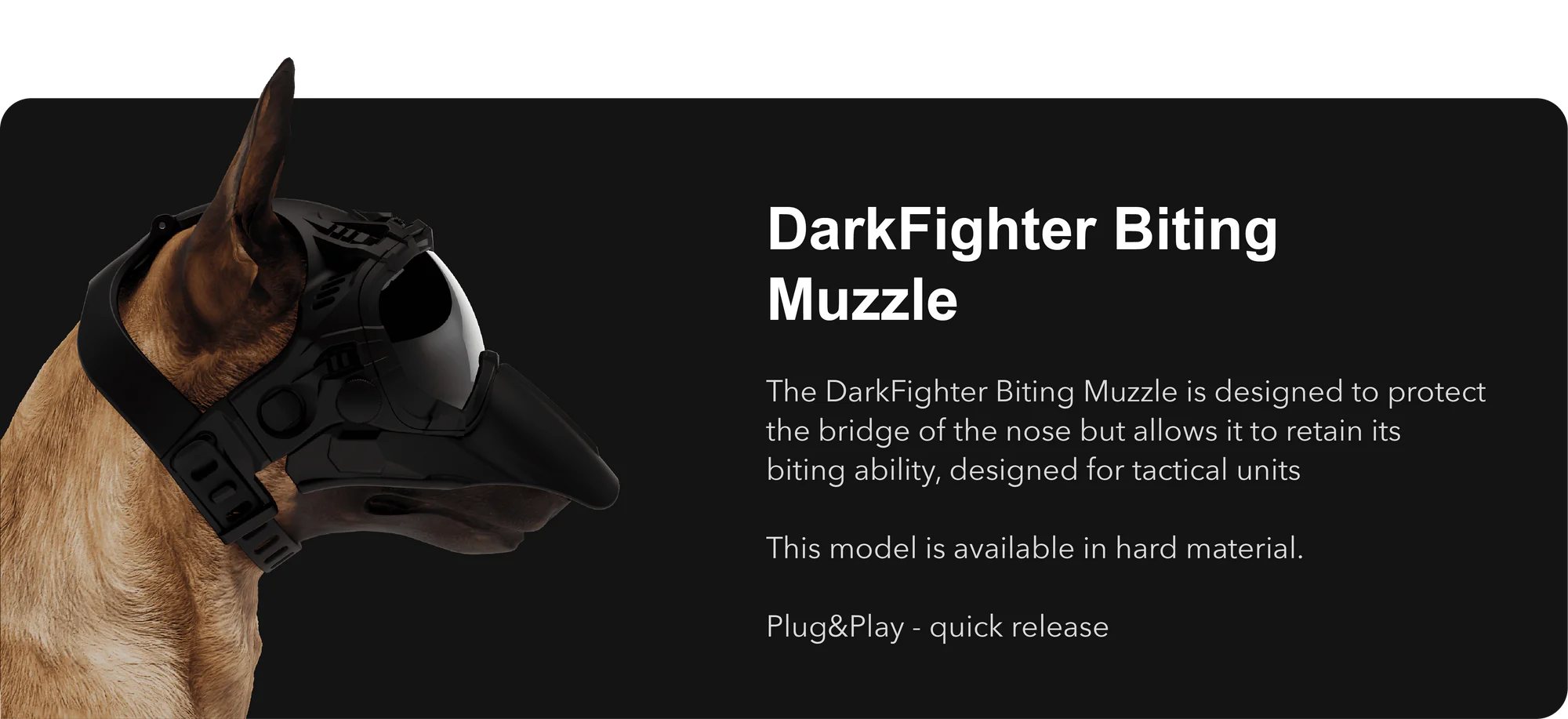 זמם הנשיכה מבית DarkFighter נועד לספק לכלבי עבודה את הבטיחות והשליטה הדרושים במהלך משימות ואימונים אינטנסיביים. הזמם מתוכנן במיוחד לשימוש עם קסדת ה-DarkFighter K9, ומציע מנגנון Plug & Play להתקנה והסרה מהירה.