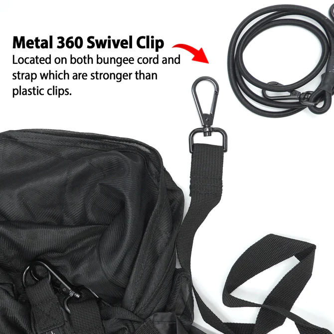 קליפים מסתובבים 360 מעלות ממתכת ממוקמים גם בכבל הבנג'י וגם ברצועה שהם חזקים ובטוחים ללא השוואה בכלל לקליפסים מפלסטיק.